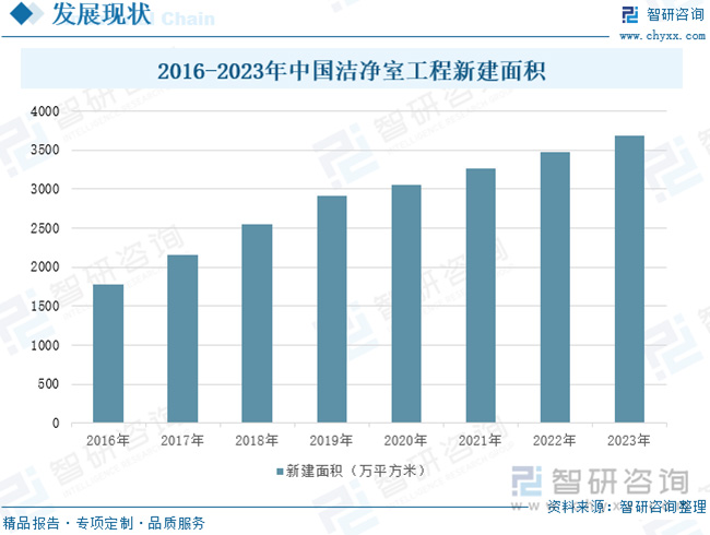 目前,全球半導(dǎo)體、光電等電子信息產(chǎn)業(yè)在世界范圍內(nèi)轉(zhuǎn)移,東亞、東南亞等地區(qū)已成為世界電子信息行業(yè)的主要市場和發(fā)展重心;同時由于我國醫(yī)藥衛(wèi)生、半導(dǎo)體、航空航天等事業(yè)的不斷發(fā)展,加速推動了潔凈室的市場化需求,從而帶動我國潔凈室工程產(chǎn)業(yè)的快速發(fā)展。2023年,中國潔凈室工程新建面積達3689萬平方米,同比增長6.04%。