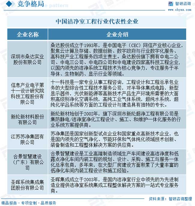 超潔凈環(huán)境控制又融合了風(fēng)險評估、生產(chǎn)認證的概念和程序,加之潔凈技術(shù)跨行業(yè)、跨專業(yè)、跨學(xué)科的特點,使得潔凈室工程的難度和復(fù)雜性增加。因此對于潔凈室工程行業(yè)來說,優(yōu)化設(shè)計、現(xiàn)場施工環(huán)境的協(xié)調(diào)與管控、工程相關(guān)技術(shù)細節(jié)的經(jīng)驗積累,對客戶需求的理解和實現(xiàn),以及對設(shè)計變更的準備和響應(yīng)程度等都是衡量潔凈室工程企業(yè)競爭能力的重要指標。?目前,我國潔凈室工程行業(yè)競爭較為激烈,企業(yè)數(shù)量較多。其中,桑達股份、十一科技、蘇凈集團、新綸新材、柏誠股份、亞翔集成等設(shè)計研究院或建設(shè)承包企業(yè)在降低建造成本、提高潔凈室的穩(wěn)定性等方面占據(jù)優(yōu)勢,能提供高端潔凈室系統(tǒng)集成解決方案,位居行業(yè)領(lǐng)先地位。同時,行業(yè)內(nèi)還存在大量規(guī)模較小、技術(shù)水平與綜合解決方案能力有限的潔凈室工程企業(yè),普遍集中在對潔凈等級要求不高的低端市場。
