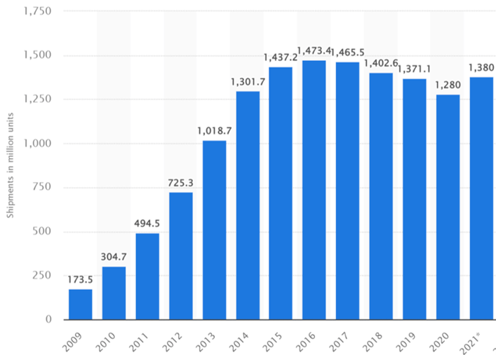 2017年以來全球手機(jī)出貨量持續(xù)下降,2021年略微回溫資料來源:Counterpoint