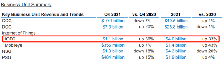 在晶圓代工巨頭臺積電公布的財(cái)報(bào)中,2021年其手機(jī)業(yè)務(wù)營收首次被HPC(大型高性能計(jì)算)業(yè)務(wù)超越,面向汽車板塊的營收和訂單需求也猛增。 圖像傳感器芯片設(shè)計(jì)龍頭韋爾股份最新財(cái)報(bào)顯示,其半導(dǎo)體業(yè)務(wù)收入同比增長18%,雖然智能手機(jī)CMOS占據(jù)營收大頭,但業(yè)績增長主要來源于車載CIS與安防CIS,尤其在安防領(lǐng)域?qū)崿F(xiàn)高達(dá)60%的業(yè)績增長。 2021年物聯(lián)網(wǎng)事業(yè)部(IoTG)成為國際半導(dǎo)體巨頭英特爾增長最快的業(yè)務(wù),同比增長33%,同時(shí)汽車自動(dòng)駕駛業(yè)務(wù)也增速驚人,反觀主營PC終端的CCG部門業(yè)績僅增1個(gè)百分點(diǎn)。