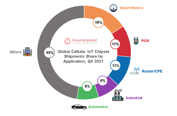 在蜂窩物聯(lián)網(wǎng)芯片中,當(dāng)前應(yīng)用規(guī)模最大的是低速率的NB-IoT芯片(占比60%),NB-IoT也是我國主推的物聯(lián)網(wǎng)連接方式,應(yīng)用在智能儀器表盤、資產(chǎn)追蹤等場景。其次是中速率的2G/3G(占比30%),用于移動(dòng)支付、智能穿戴和智能家居中。4G Cat.1和5G大約占比10%, 5G模組的成本過高,加上大部分物聯(lián)網(wǎng)終端對傳輸速率的需求性不高,5G在物聯(lián)網(wǎng)終端的應(yīng)用占比較低,主要是自動(dòng)駕駛和視頻監(jiān)控領(lǐng)域,但隨著2G/3G轉(zhuǎn)網(wǎng),Cat.1在智能支付、定位追蹤、車載終端、視頻監(jiān)控領(lǐng)域的高速增長,正逐漸打破蜂窩物聯(lián)網(wǎng)6:3:1的格局。從應(yīng)用場景來看,智能表計(jì)、POS支付、路由器/CPE、工業(yè)、汽車是蜂窩物聯(lián)網(wǎng)芯片應(yīng)用最廣泛的前五大場景。